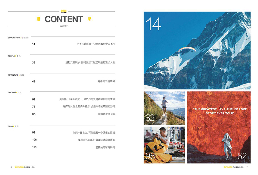 專門玩法、探險之旅、自游自在、行者文摘、戶外人生、穿越手記、人車生活、先睹為快、裝備等。